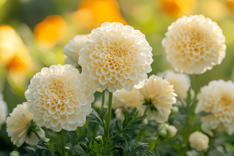Бархатцы сорта «Белоснежка» — это многолетник-нежность с крупными махровыми цветами, которые напоминают пушистые помпоны из нежного белого крема.