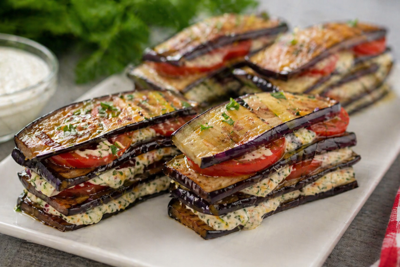 Пеку баклажаны слайсами — они становятся мягкими, сочными, с лёгкой румяной корочкой. А потом собираю из них простые пирамидки с быстрым соусом — и на столе уже не просто овощи, а сытная, ароматная закуска, которую разбирают быстрее мяса.